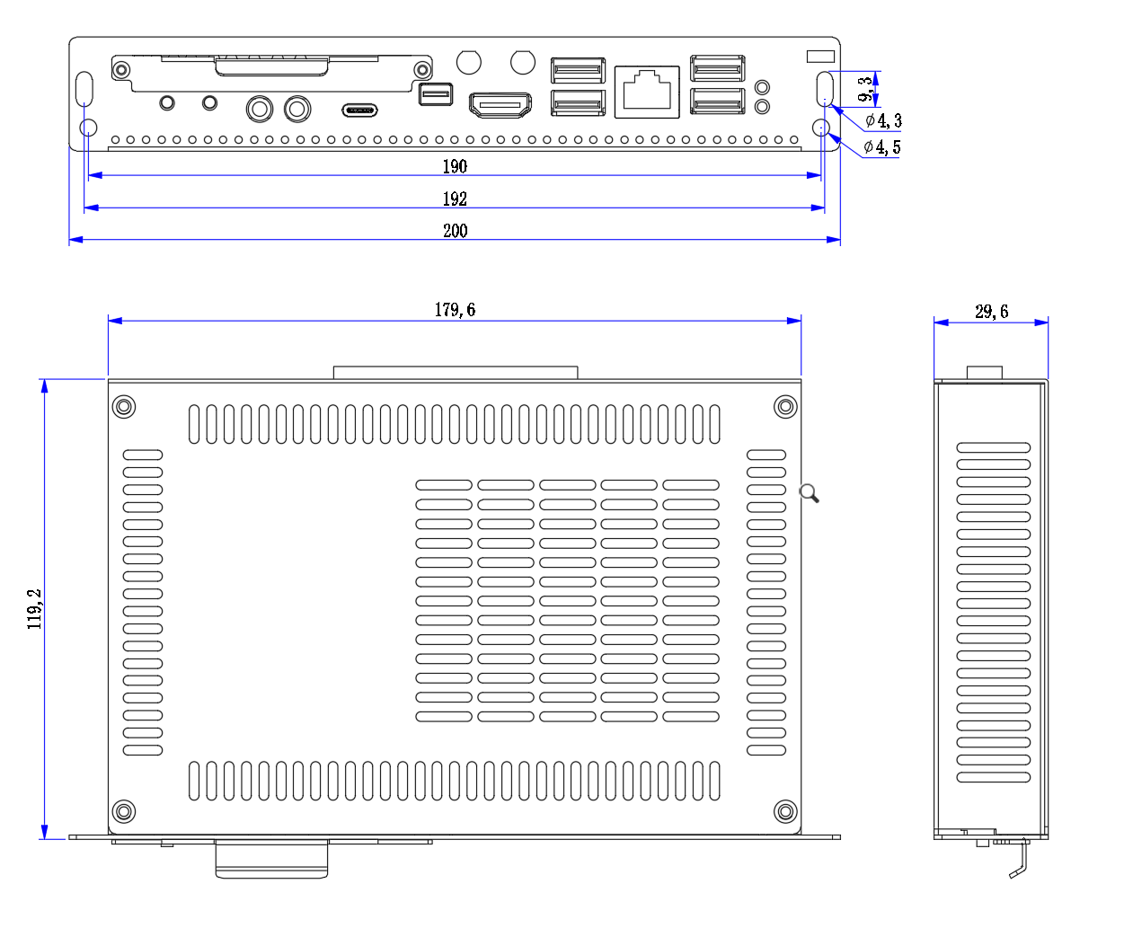 1*Type-C,1*Mic-in,1*Line-out,1*DC JACK電源接口 |