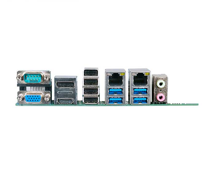 DB9 COM1 (RS232, 5V/12V output selected by jumping cap), VGA, HDMI, DP |